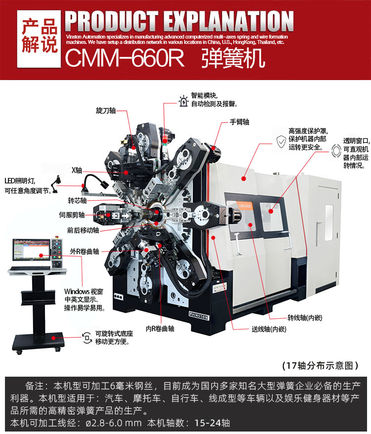 2、擁有傳統(tǒng)8工位機械之優(yōu)點、并兼?zhèn)?組自由手,可以上下、左右、自由發(fā)揮(生產(chǎn)高難度的彈簧、更容易、更快捷、更精密)。
