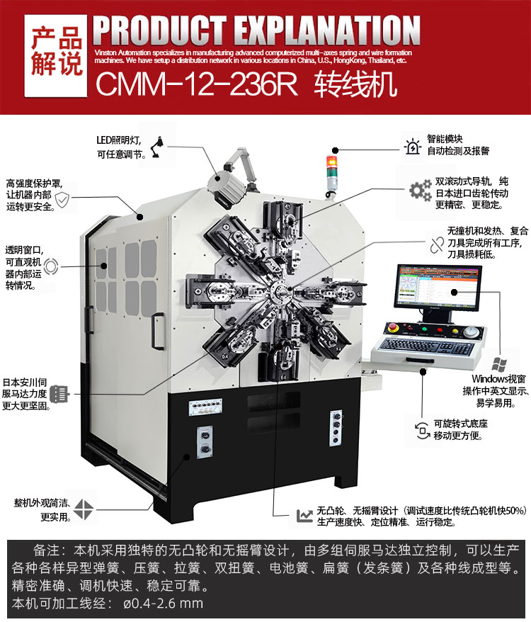 本機型適用于生產(chǎn)電子、電器、文具、儀器、玩具、發(fā)飾、工藝品、線成型等高難度精密彈簧,尤其針對各種內(nèi)(外)雙扭簧特別適合。