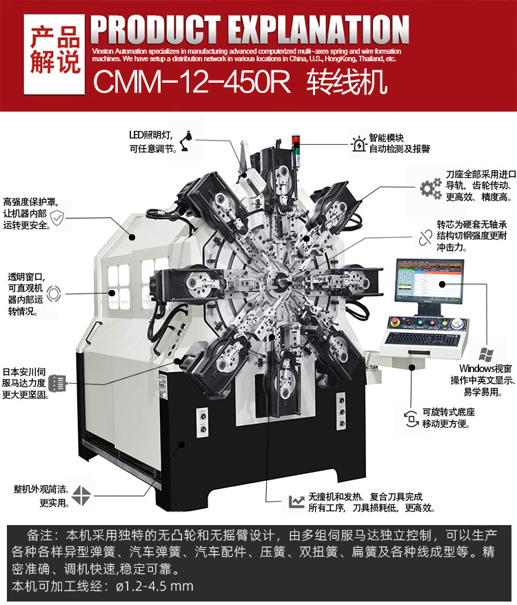 本機型適用于生產(chǎn)電子、電器、文具、儀器、玩具、發(fā)飾、工藝品、線成型等高難度精密彈簧。